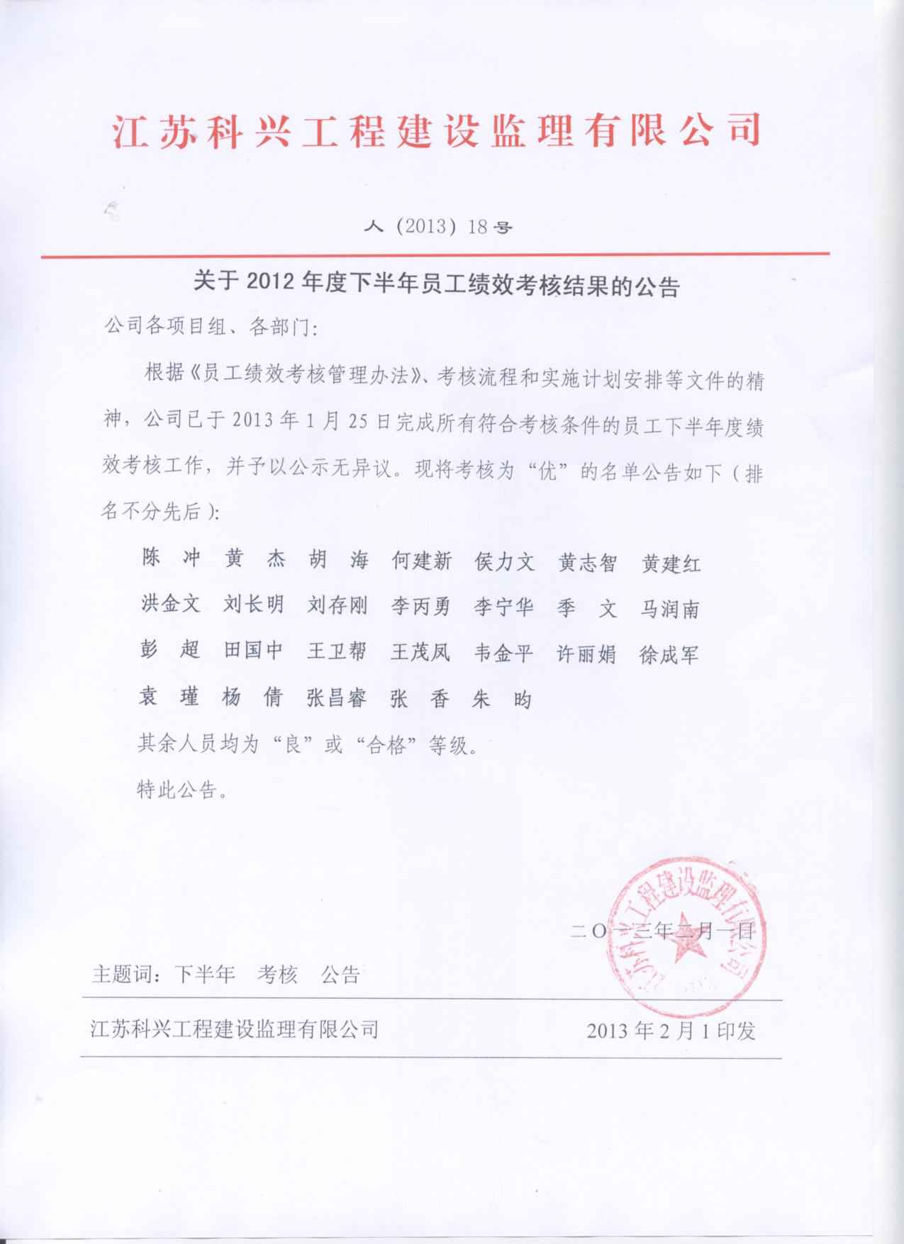 关于2012年度下半年员工绩效考核结果的公告