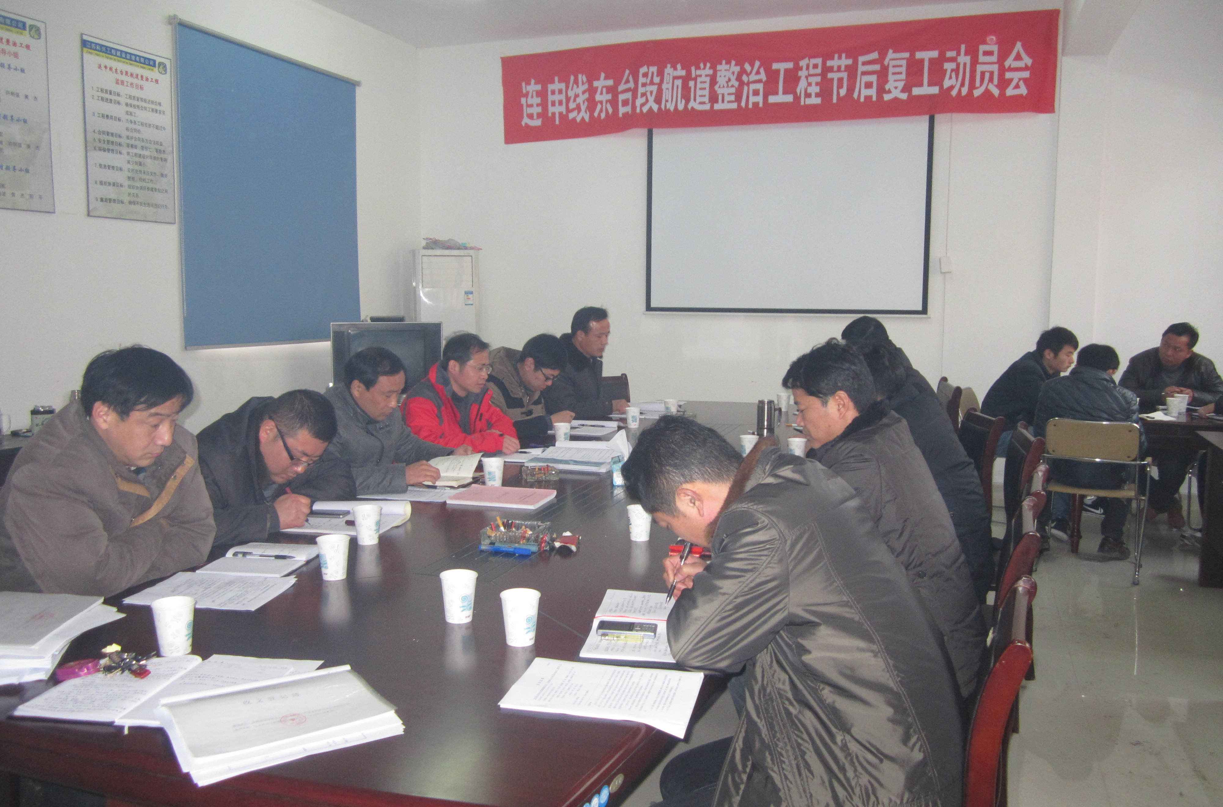 2013222日,连申线东台段航道监理组组织召开节后复工动员会,参加会议人员有:项目办领导、项目经理、总工、施工队长以及监理人员。会议就再次明确了工程复工时间;并对现场安全隐患排查及以6月工程交工为目标进行了详细的安排。会议要求各项目部制定详细的剩余工程量进度分解计划,要求细化到各施工班组及每一天;制定考核制度,考核到各班组、每个参建人员,做到日考核,周考核。