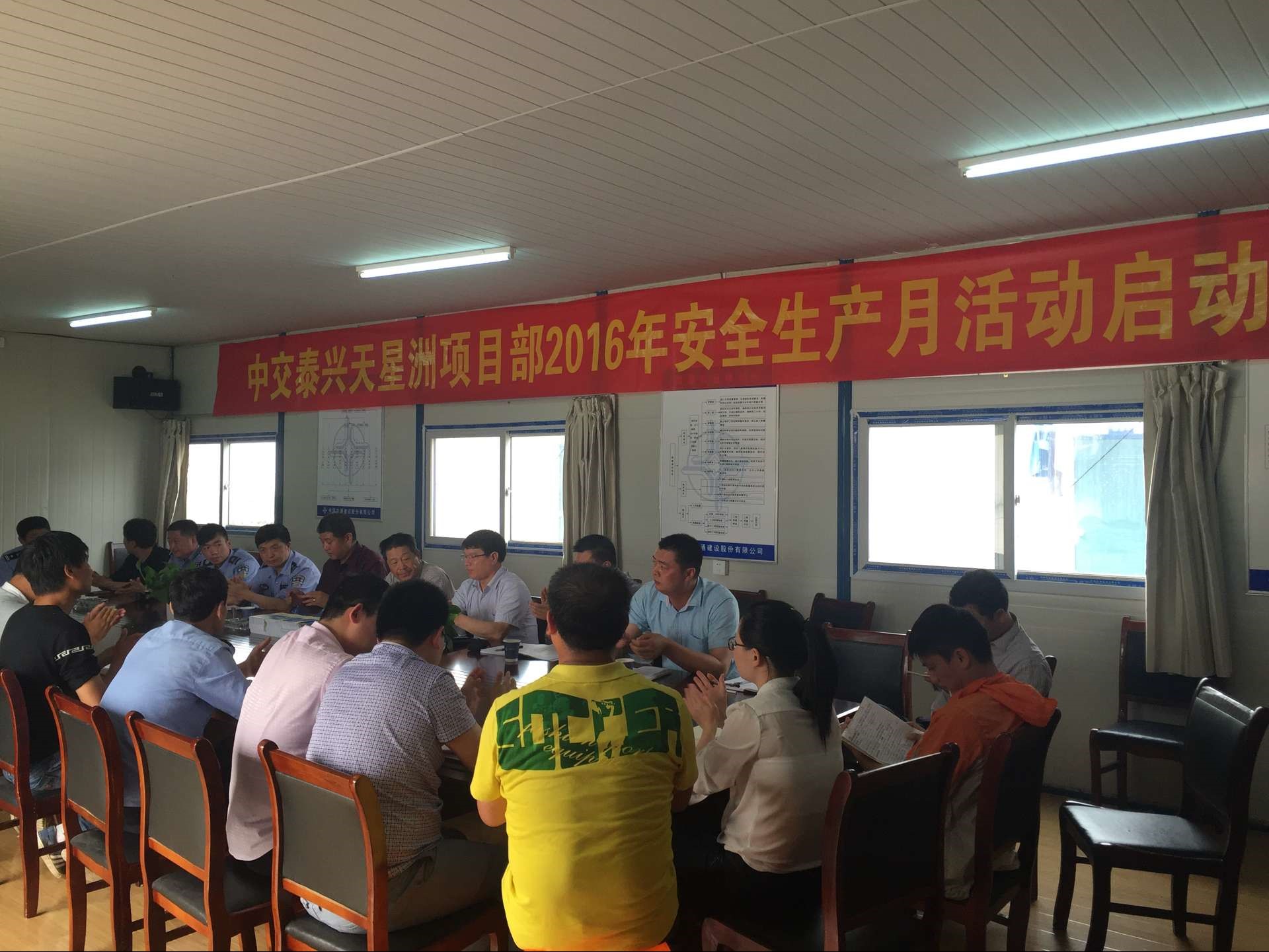 中交泰兴投资建设有限公司同意了本次安全生产月活动方案实施;天星洲整治项目部宣贯了安全月活动方案内容,明确了分阶段的活动计划;总监办安全监理工程师对安全生产月活动开展全面推进安全生产工作提出具体要求,发放安全宣传册,并组织宣誓签名仪式。