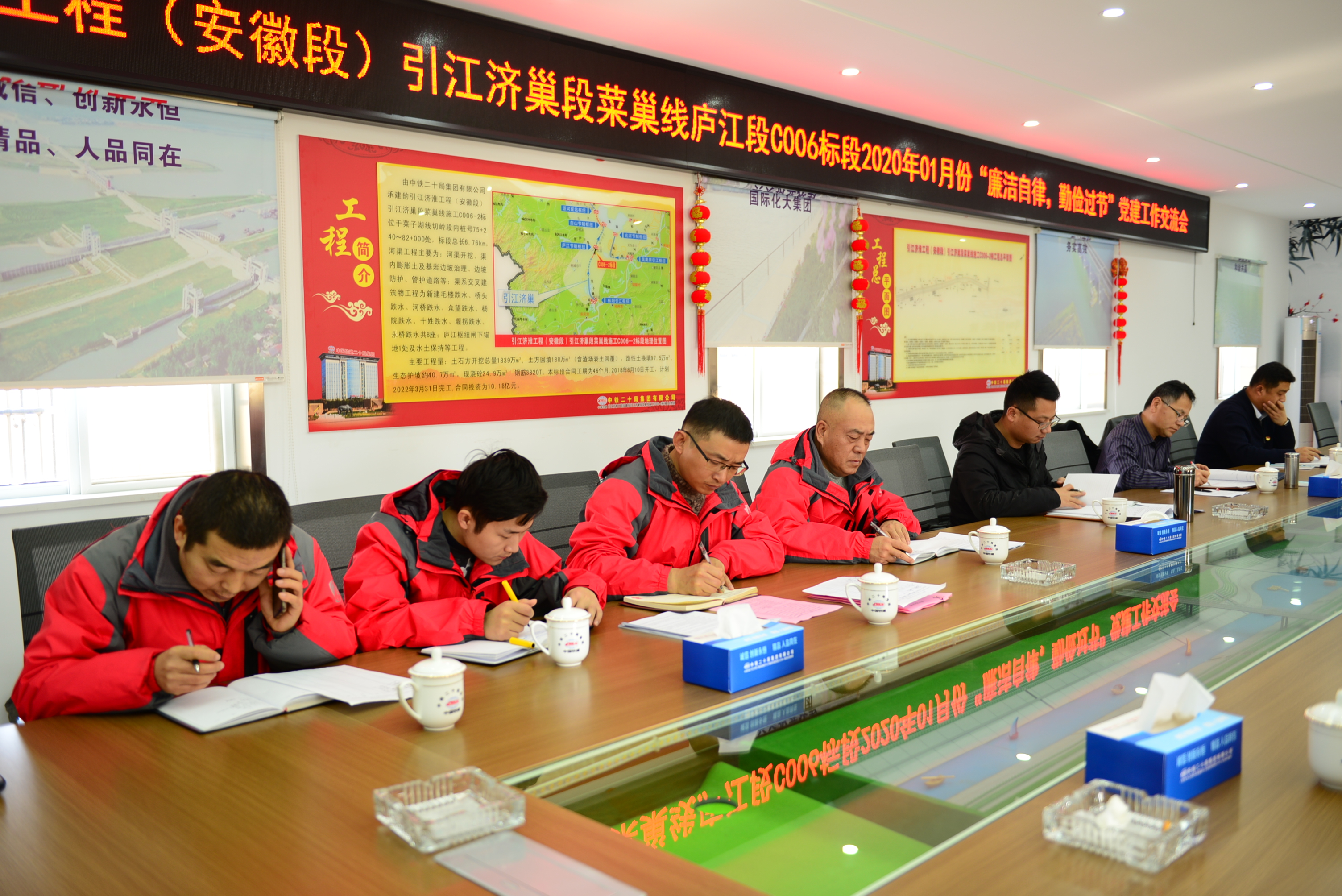 春节将至,为正确引导参建各方广大党员干部牢固树立法纪观念,增强廉洁从业意识,自觉抵制各种不正之风,将公司严明春节期间有关纪律要求作为巩固作风建设成果的重要举措,营造一个廉洁自律、风清气正、平安祥和的节日氛围,2020年1月7日下午,江苏乐动(中国)引江济淮C006标监理部联合引江济淮集团庐江建管处、中铁十局C006-1标及中铁二十局C006-2标项目部党支部,在中铁二十局项目部组织开展了“廉洁自律 勤俭过节”党建工作交流活动。