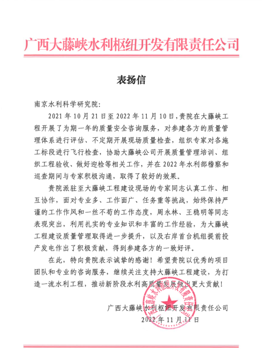 近日,公司质量安全咨询团队代表南科院参与的广西大藤峡水利枢纽工程质量安全咨询服务受到广西大藤峡水利枢纽开发有限责任公司的来信感谢,团队专业严谨的工作作风和态度得到了业主单位的高度表扬。 2021年10月21日至2022年11月10日,公司质量安全咨询团队积极配合做好大藤峡水利枢纽工程建设的质量安全保障工作。团队成员面对专业多、工作面广、任务重等挑战,始终保持严谨的工作作风和一丝不苟的工作态度,凭借扎实的专业知识和丰富的工作经验,为提升大藤峡工程建设质量管理水平,以及右岸首台机组提前投产发电作出了积极贡献,得到参建各方的一致好评。 下一步,公司继续加强质量安全咨询等转型人才建设,提升科技创新能力,持续探索推动公司咨询业务转型之路。