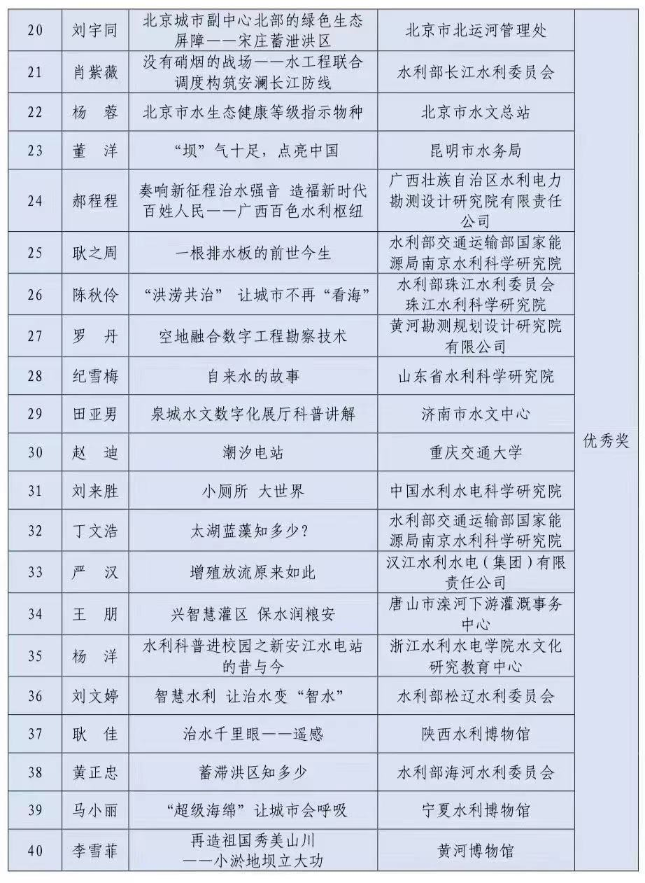 近日,由水利部国际合作与科技司指导,水利部宣传教育中心、中国水利水电科学研究院主办,广西大藤峡水利枢纽开发有限责任公司协办的第三届全国水利科普讲解大赛圆满结束。公司员工成舒扬代表南京水科院参赛,经过来自水利部直属单位、省(自治区、直辖市)水利(水务)厅(局)、国家水情教育基地及水利系统全国科普教育基地等62家单位的68名选手的激烈角逐,公司员工成舒扬在比赛中突出重围,获得一等奖的好成绩!