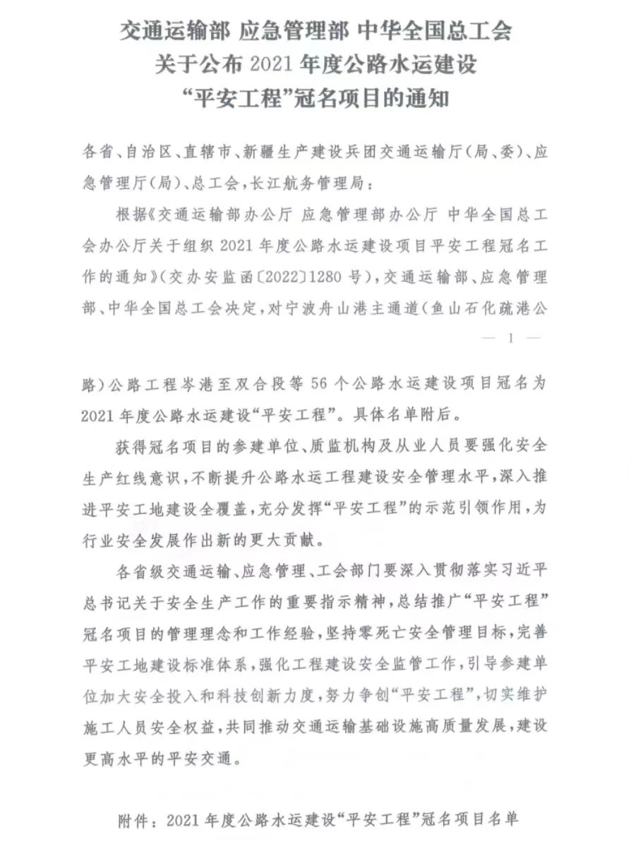 公司又一项目荣获2021年度公路水运建设“平安工程”冠名