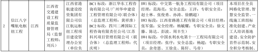 信江航运枢纽项目“网格化管理在水运工程中的运用”于2020年被交通运输部评选为“平安交通”优秀案例,2021年入选第一批交通运输部平安百年品质工程创建示范项目,项目连续四年获全省公路水运工程平安工地第一名。江西信江航电枢纽绿色智慧科技示范工程依托八字嘴航电枢纽项目,获交通运输部批复立项,并于2023年4月通过交通运输部科技司验收。2020年,我公司监理的八字嘴管理区宿舍楼被住建部认定为首批《装配式建筑评价标准》范例项目。
