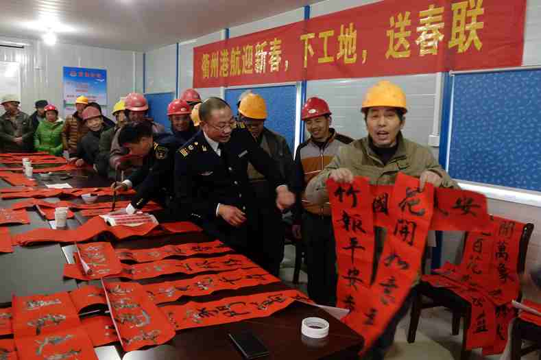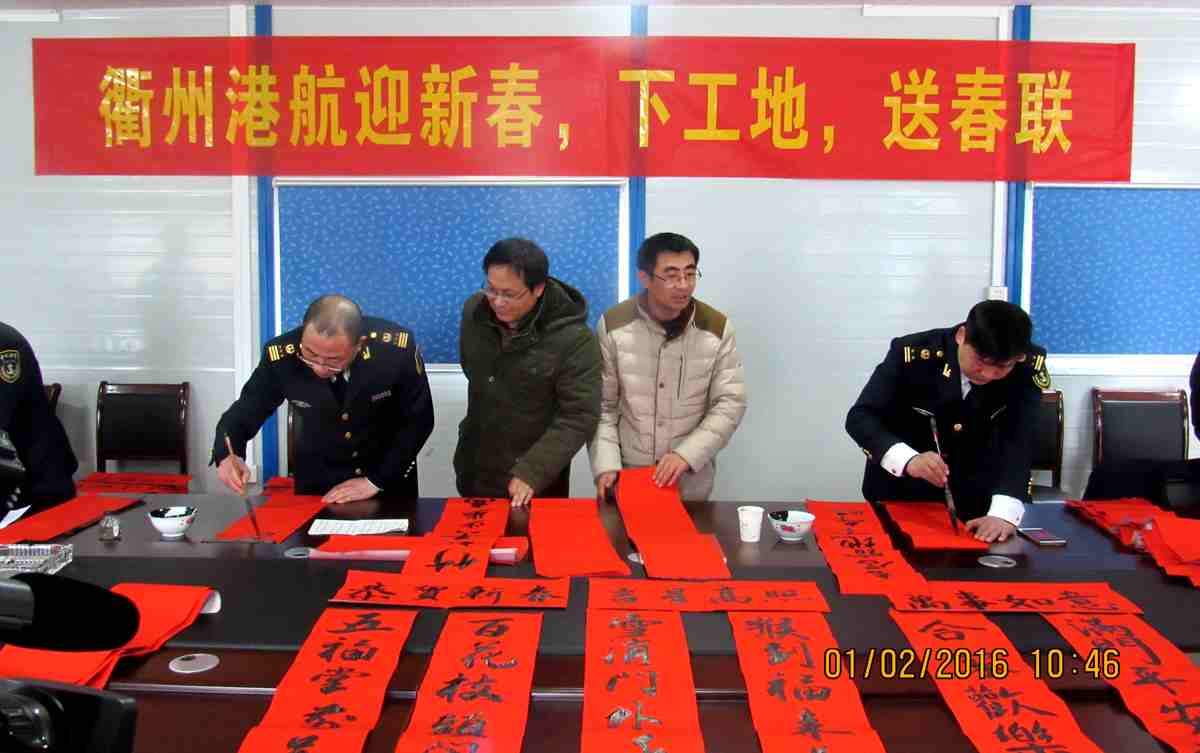 2016年2月1日上午,衢州市港航局周局长带队,走进塔底船闸施工现场,开展了“迎新春,下工地,送春联” 活动。为奋战在一线的监理、施工人员挥毫泼墨,书写对联,送来吉祥与祝福。 在两个多小时的活动中,现场气氛热烈,周局长等4名港航局领导现场书写对联,并亲手发送到民工兄弟手中,传递着爱心和对新年的美好祝福,寓意猴年一切顺利,为施工现场增添了浓浓的“年味”。 借此活动,也预祝塔底船闸工程来年“千般顺、万事兴、四季都平安!”(塔底船闸工程总监办) |