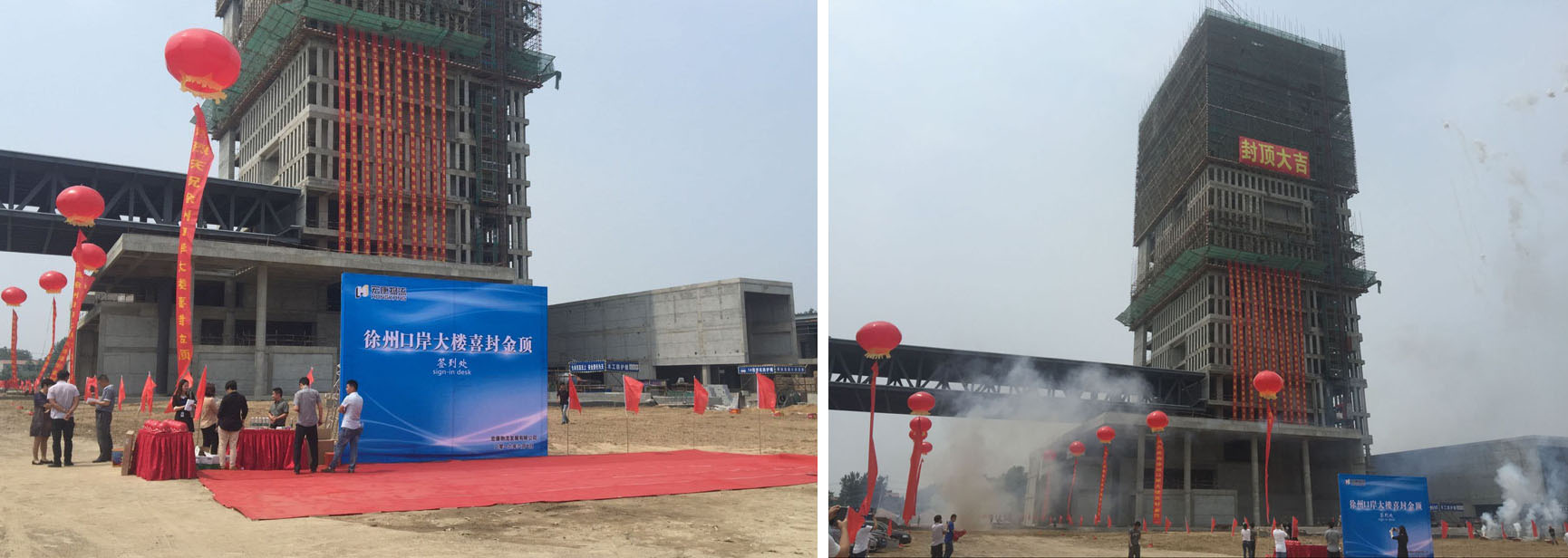 2016年6月7日,晴空万里、清风徐来,由宏康物流发展有限公司开发、乐动在线注册监理、荣盛建设工程有限公司施工的徐州市淮海经济区现代物流服务枢纽口岸大楼举行了隆重的封顶仪式。现场彩旗飘飘,横幅高挂,处处洋溢着喜庆的气氛。出席此次封顶仪式的有宏康物流发展有限公司董事长田海勇、贾汪区工业园区主任等相关领导,以及参与项目施工、监理的一线全体人员。
