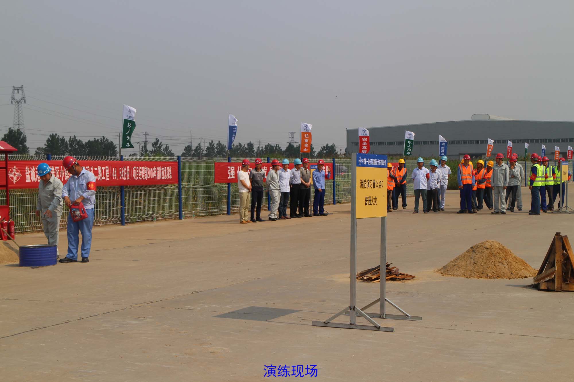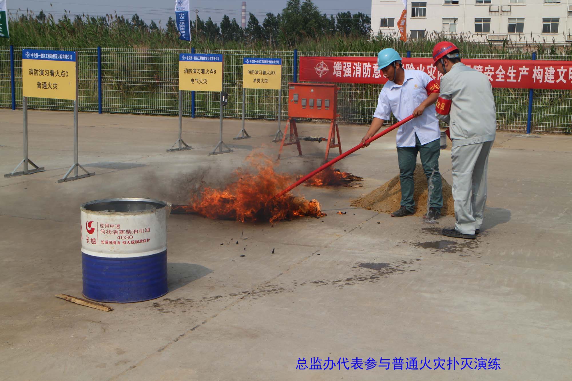 此次演练分油类火灾、电器火灾、普通火灾三类起火源进行。针对不同的起火源演练过程采用了各种针对性的灭火方式,总监办派代表进行了普通火灾扑灭的演练。