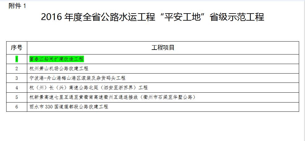 近日,从浙江省交通运输厅再传喜讯,富春江船闸扩建改造工程被评为2016年度全省公路水运“平安工地”省级示范工程。